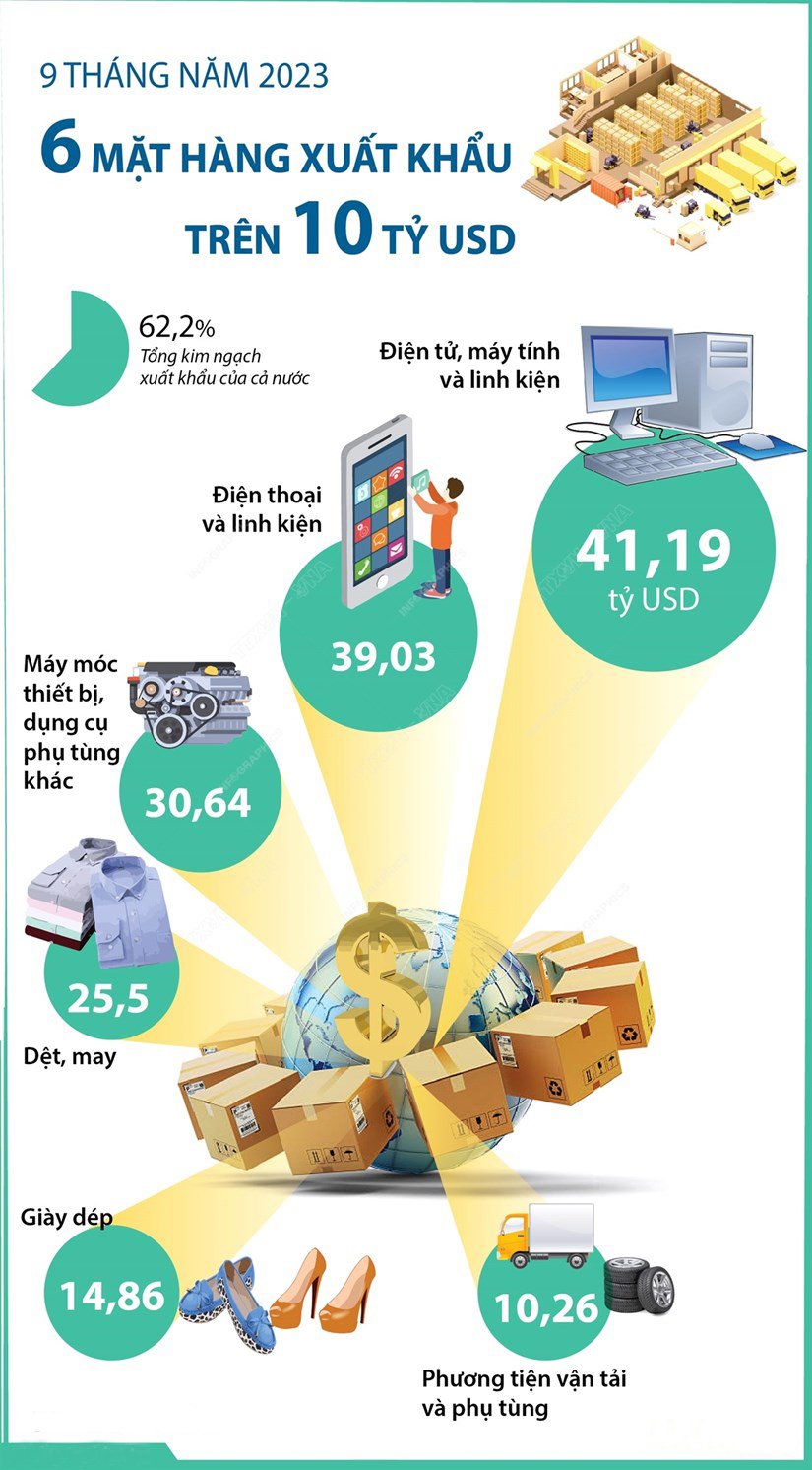 Theo Tổng cục Thống kê, 9 tháng năm 2023, có 6 mặt hàng xuất khẩu trên 10 tỷ USD, chiếm 62,2% tổng kim ngạch xuất khẩu cả nước.